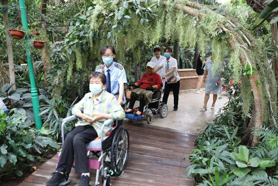 隨后,志愿者和護(hù)工們推著輪椅上的截癱休養(yǎng)員、挽著智障兒童,乘坐兩輛新能源低踏板公交車來(lái)到南湖景區(qū)植物風(fēng)情館參觀游覽。一行人漫步在高大茂盛的熱帶植物叢林中,志愿者按照標(biāo)識(shí)耐心地為截癱休養(yǎng)員和智障兒童講解植物信息,愉快的交談引得歡聲笑語(yǔ)久久回蕩。“現(xiàn)在城市發(fā)展越來(lái)越快,公交車也越來(lái)越舒適了,雖然離南湖很近,但是我們出來(lái)不方便,這次能出來(lái)看看,真是特別感謝。”一位截癱休養(yǎng)員高興地說(shuō)。